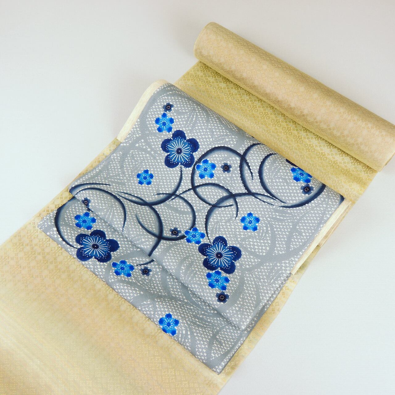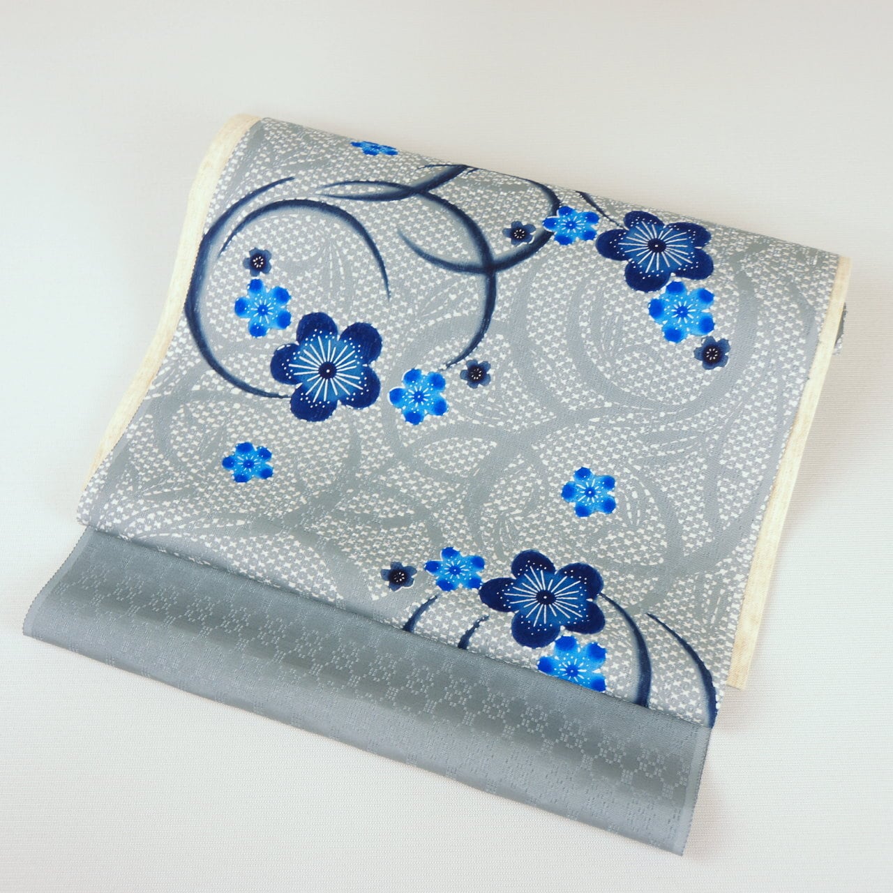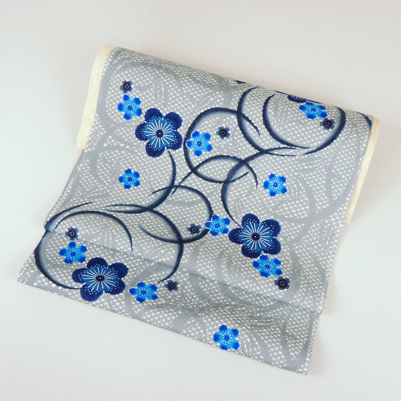 薄いグレー地に青色で梅とつゆ草柄がすっきりとした紅型です。