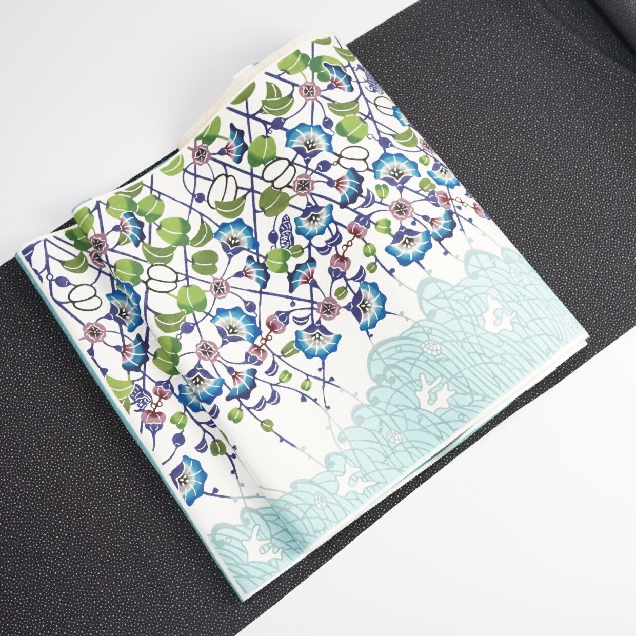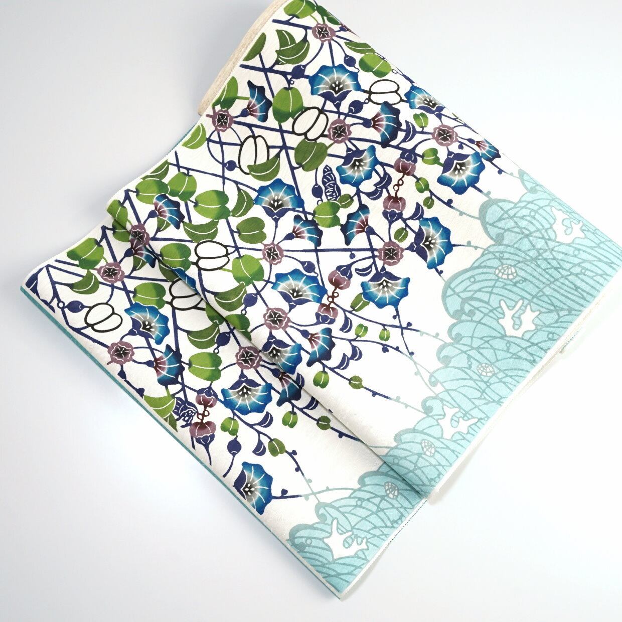 色合いがとても優しく、紅型の発色の良さを生かしながら、柔らかい印象も持たせた素敵な帯です。