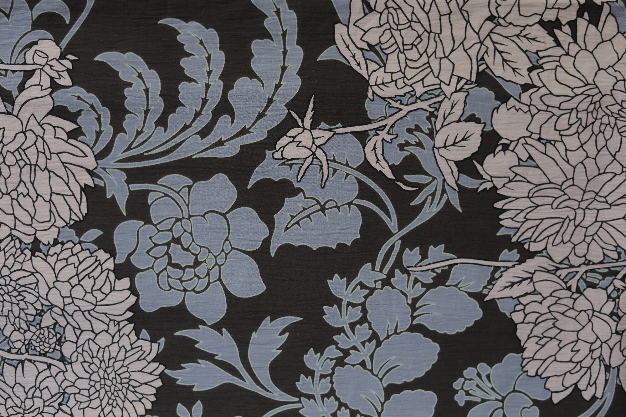 西洋のフラワーモチーフをかき消す様にシルエットの花束が覆う。花束をシルエットにすることで季節感や花柄の持つ田舎臭さを消すことに挑戦しました。